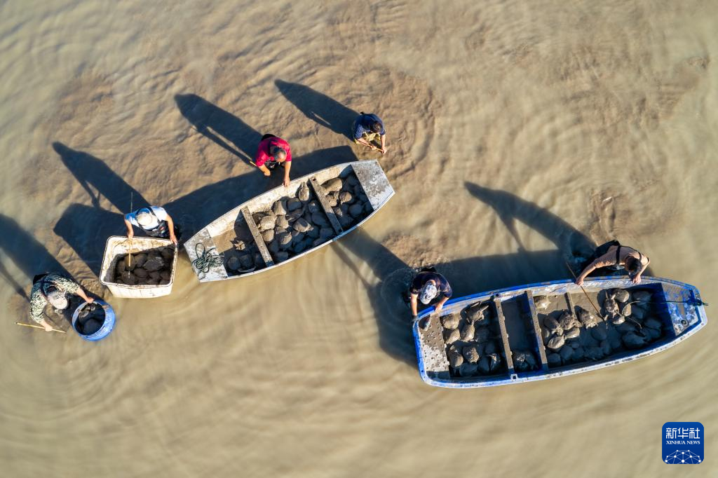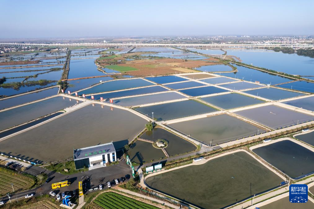11月29日,在位于漢壽縣的湖南華甲農業集團有限公司生態甲魚產業園,工人在捕撈甲魚(無人機照片)。新華社記者 陳思汗 攝