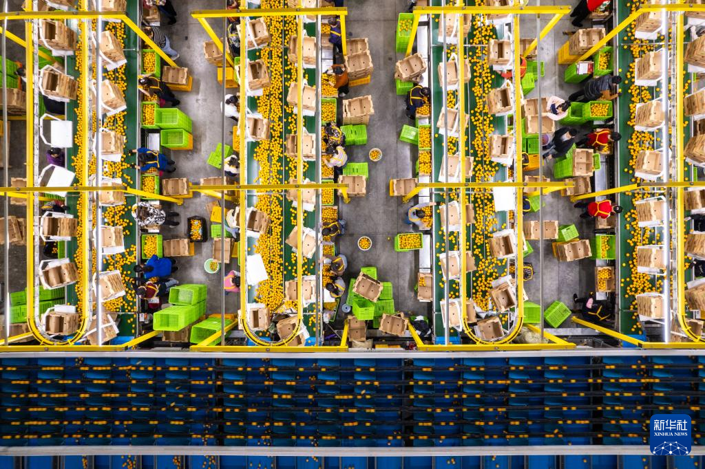 11月1日,在位于石門縣的湖南湘佳橘友農業有限公司,工人在包裝柑橘(無人機照片)。新華社記者 陳思汗 攝