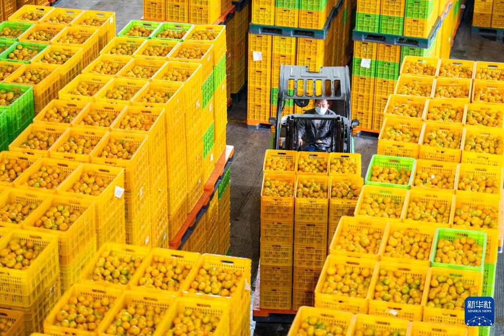 11月1日,在位于石門縣的湖南湘佳橘友農業有限公司,工人在運輸柑橘。新華社記者 陳思汗 攝