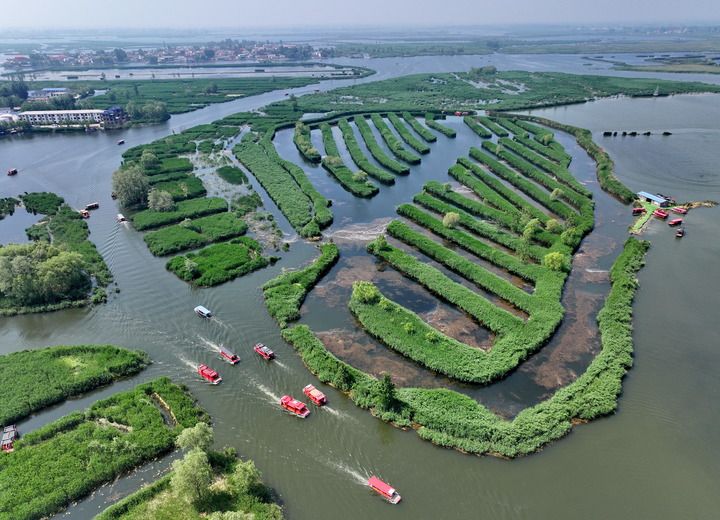 游船在河北雄安新區白洋淀內游覽(2024年5月8日攝,無人機照片)。新華社記者 牟宇 攝