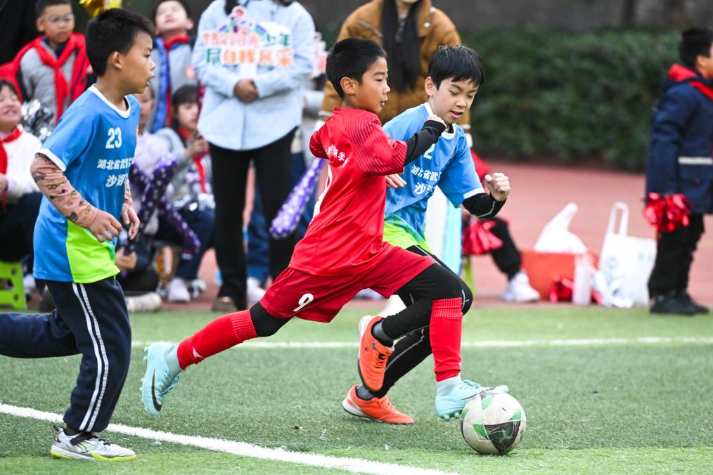 2024年12月2日,湖北省武昌實驗中學沙湖學校學生在四年級組足球聯賽決賽中拼搶。新華社記者 肖藝九 攝