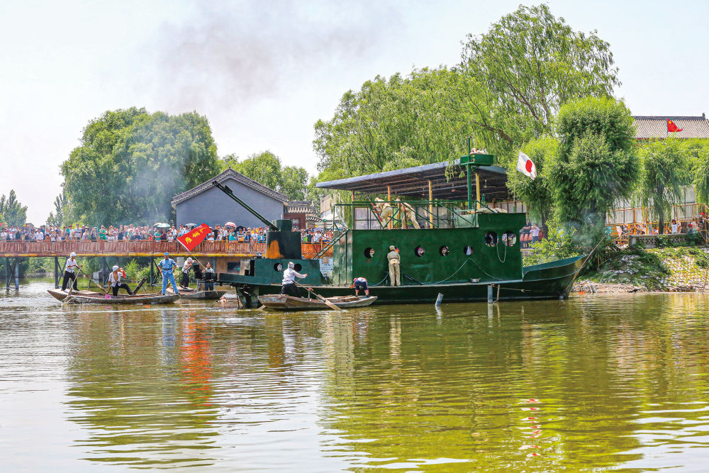6月1日,在白洋淀雁翎隊紀念館前,當地演員在表演雁翎隊隊員打鬼子。新華社記者殷剛攝