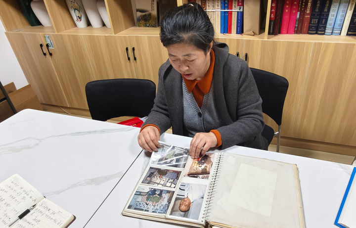 槐澤民的女兒槐巧萍在翻看父親的照片(2024年11月13日攝)。新華社記者 蘇凱洋 攝