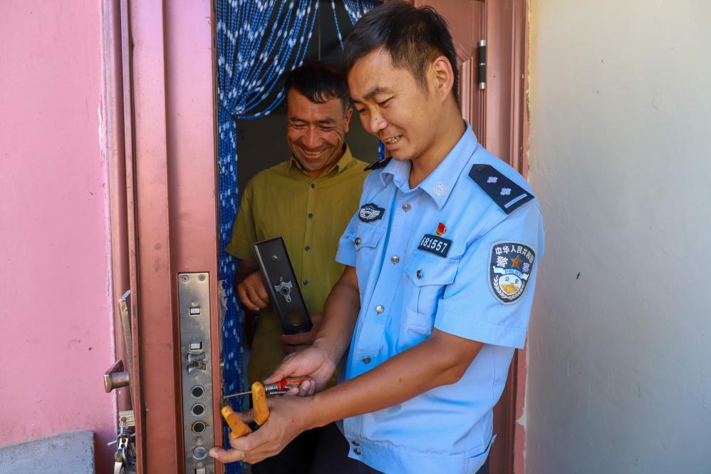 下馬崖邊境派出所民警何春明在為居民維修入戶門。(受訪者供圖)