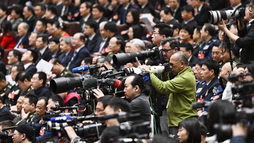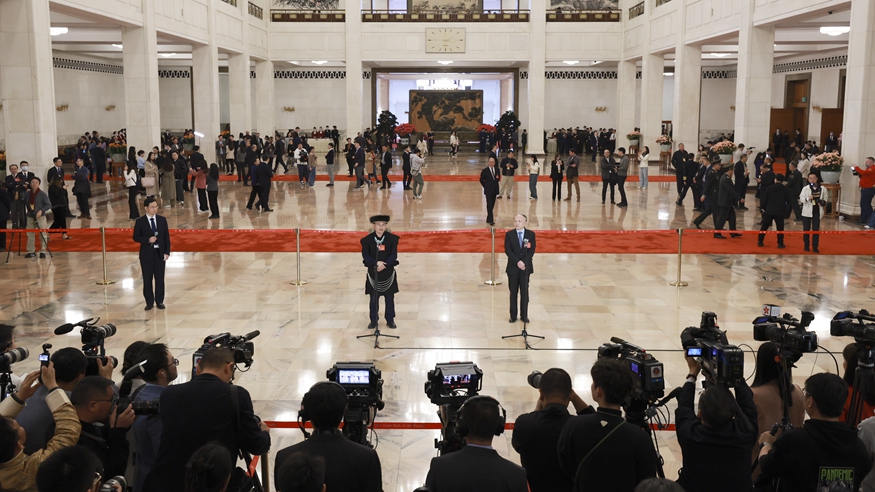 - 5日上午8時許,人民大會堂中央大廳北側,十四屆全國人大二次會議首場“代表通道”開啟。6位全國人大代表面對中外記者,分享追夢故事,暢談履職心聲,傳遞信心力量。