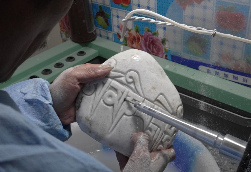 2024年10月17日,村民在崗巴布民族手工藝品專業合作社內雕刻瑪尼石(視頻截圖)。新華社發(杜笑微攝)