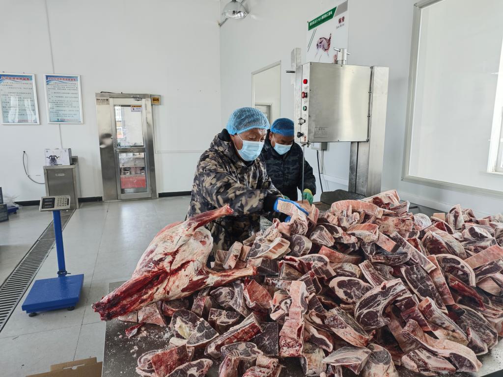 2024年1月23日,長江源村村民在村內精深加工基地加工牦牛肉。新華社發(梁亮攝)