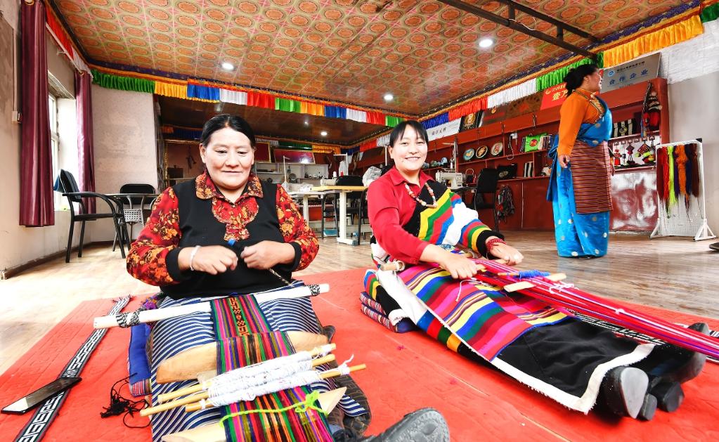 2024年6月11日,村民在長江源村崗巴布民族手工藝品加工專業合作社加工氆氌。新華社發(馮春梓攝)