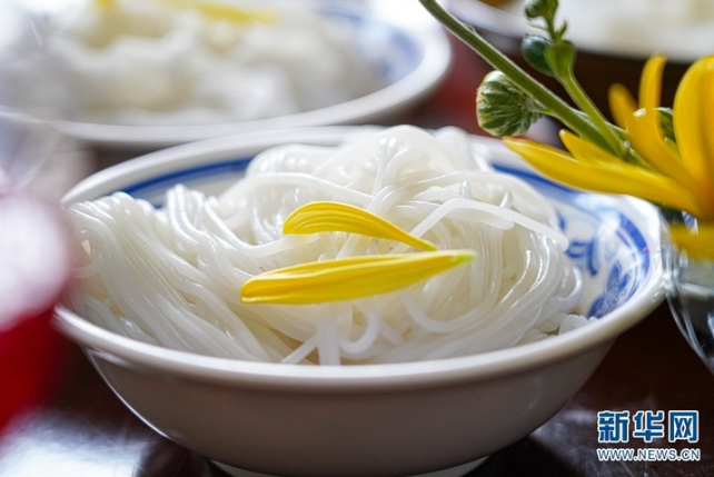 在蒙自市雨過鋪街道花卉種植基地,大棚里種植的食用菊花競相綻放。金黃色的菊花作為過橋米線配料,不僅供應蒙自市內米線店,還銷往云南省內外多個城市。據了解,雨過鋪街道現有菊花規模超過600畝,食用菊花畝產值能達到4萬元左右,除了用于過橋米線,還被加工為花茶、花酒,成為當地群眾增收的渠道之一。