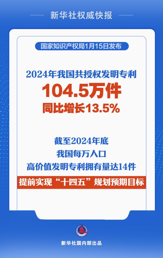 2024年我國共授權發明專利104.5萬件,同比增長13.5%,全年注冊商標478.1萬件,同比增長9.1%;截至2024年底,我國每萬人口高價值發明專利擁有量達14件,提前實現“十四五”規劃預期目標,我國國內發明專利有效量達475.6萬件,成為世界上首個突破400萬件的國家……