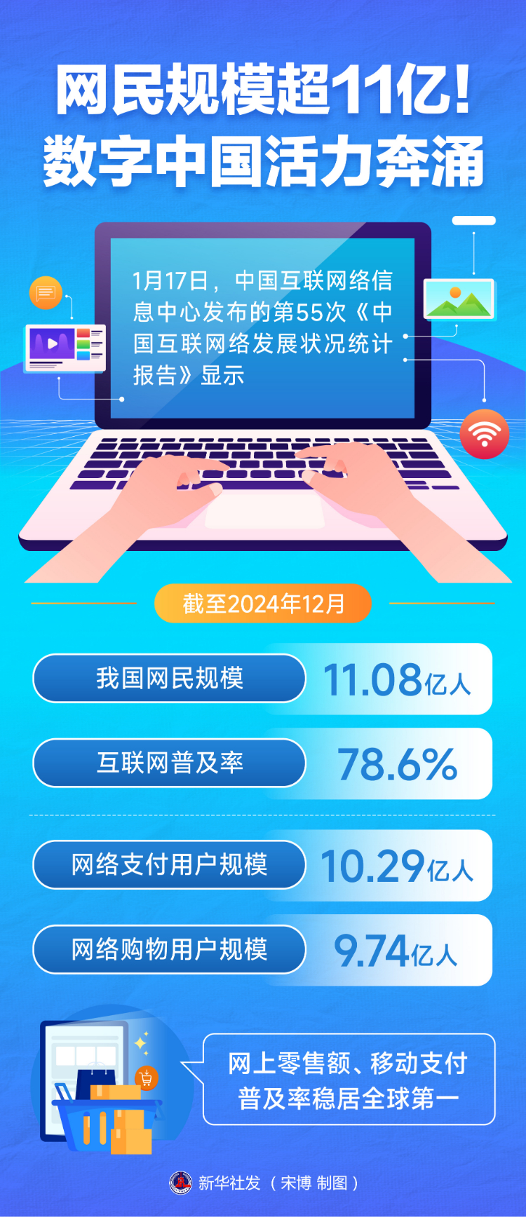 1月17日,中國互聯網絡信息中心發布的第55次《中國互聯網絡發展狀況統計報告》顯示,截至2024年12月,我國網民規模達11.08億人,互聯網普及率達78.6%;網絡支付用戶規模達10.29億人,網絡購物用戶規模達9.74億人,網上零售額、移動支付普及率穩居全球第一。