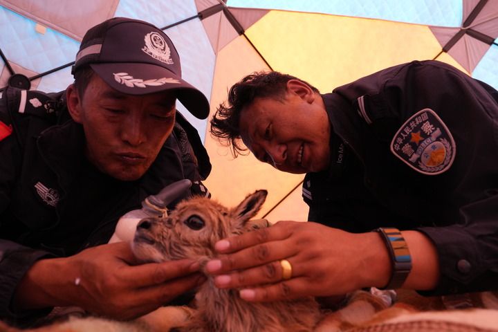 在可可西里無人區腹地卓乃湖附近,巡山隊隊員尼瑪扎西(左)秋松多杰(右)給剛救助的小藏羚羊喂奶(2024年7月8日攝)。新華社發(杜笑微攝)