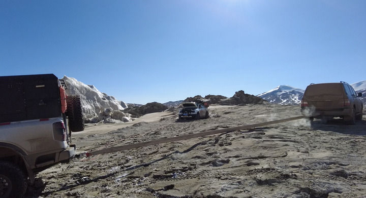 可可西里巡山隊隊員在巡山過程中用拖車繩拉出被困車輛(2025年1月14日攝)。新華社發(杜笑微攝)