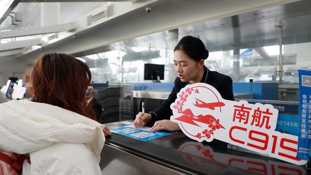 2024年1月26日,在上海虹橋機場,乘客準備搭乘中國東方航空公司的國產大型客機C919飛往成都天府國際機場。這是C919首度服務春運。