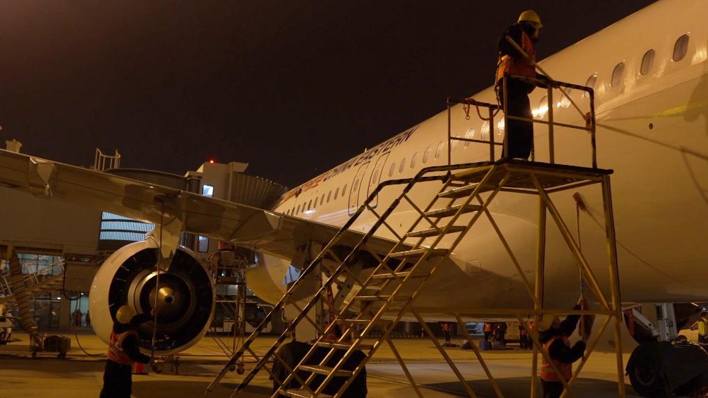 深夜,C919的“體檢醫生”開始了他們的大工程。從發動機、起落架到機艙內設施,不放過任何一個細節,一絲不茍、分毫不差的檢測確保飛機安全穩定運行。