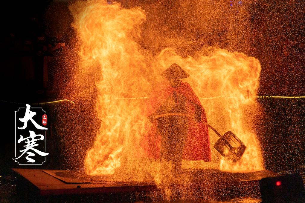 ↑在重慶市沙坪壩區重慶融創文旅城渝樂小鎮拍攝的火壺表演。CICPHOTO/孫凱芳 攝