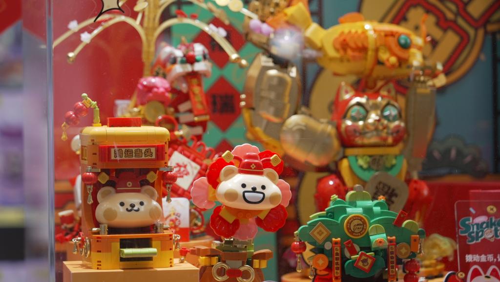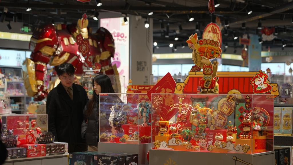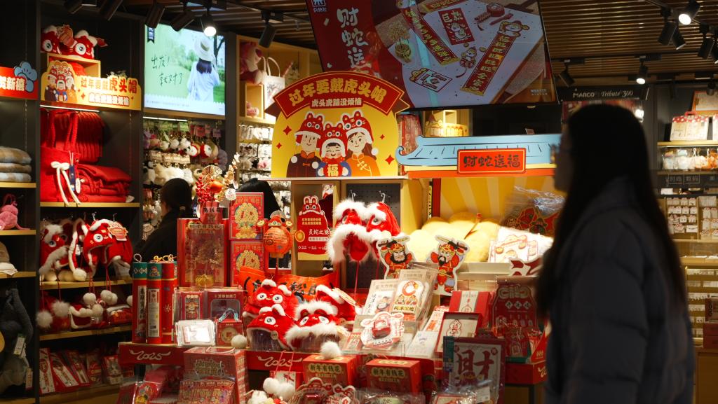 “閑來逛市場,年貨盡琳瑯?!背允呈悄晡?,裝飾是彩頭,年貨市場紅紅火火。在江西南昌一商超內,購置年貨的消費者人頭攢動。不遠處一家潮玩店也是門庭若市,店內潮流人偶戴上“財神帽”,顆粒拼裝的積木花蕊在枝頭綻放,舞獅、錦鯉、招財貓等節日“使者”穩居C位……