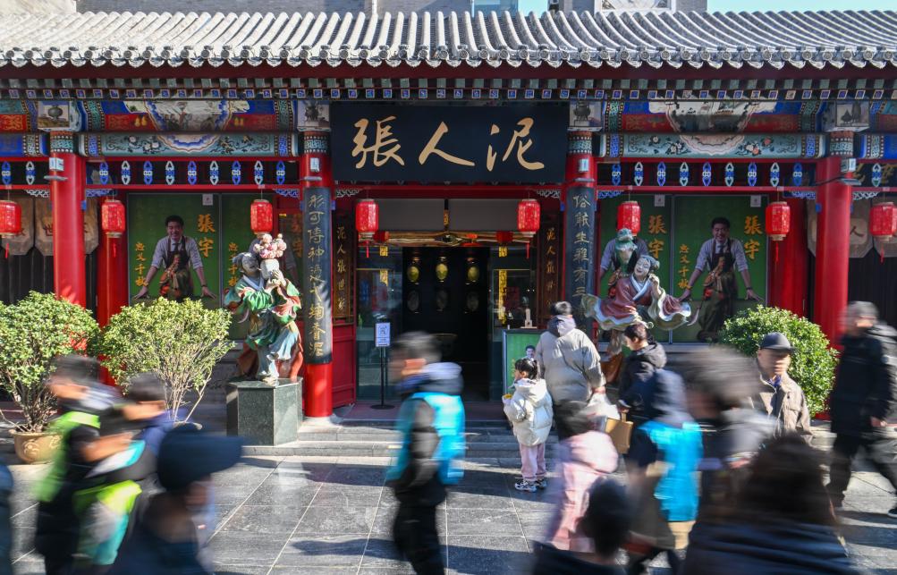 中午時分,泥人張店鋪依舊人氣滿滿?!按汗澠陂g,全國各地的游客紛至沓來。我們希望這間店鋪成為展示天津民間藝術精粹、宣介津派文化和特色非遺的一扇重要窗口?!睆堄钫f。
