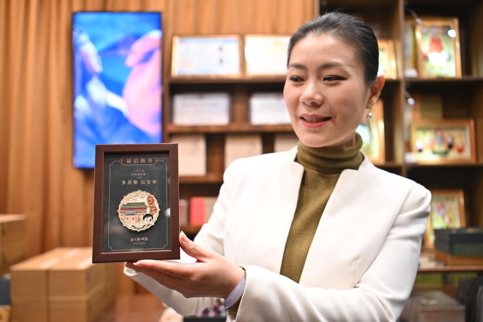 在天津古文化街,泥人張世家副總經理李丹向記者展示一款泥人張新年文創產品。新華社記者 孫凡越 攝