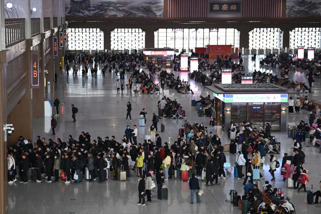 在西安站候車大廳,旅客排隊檢票乘車。新華社記者 李一博 攝