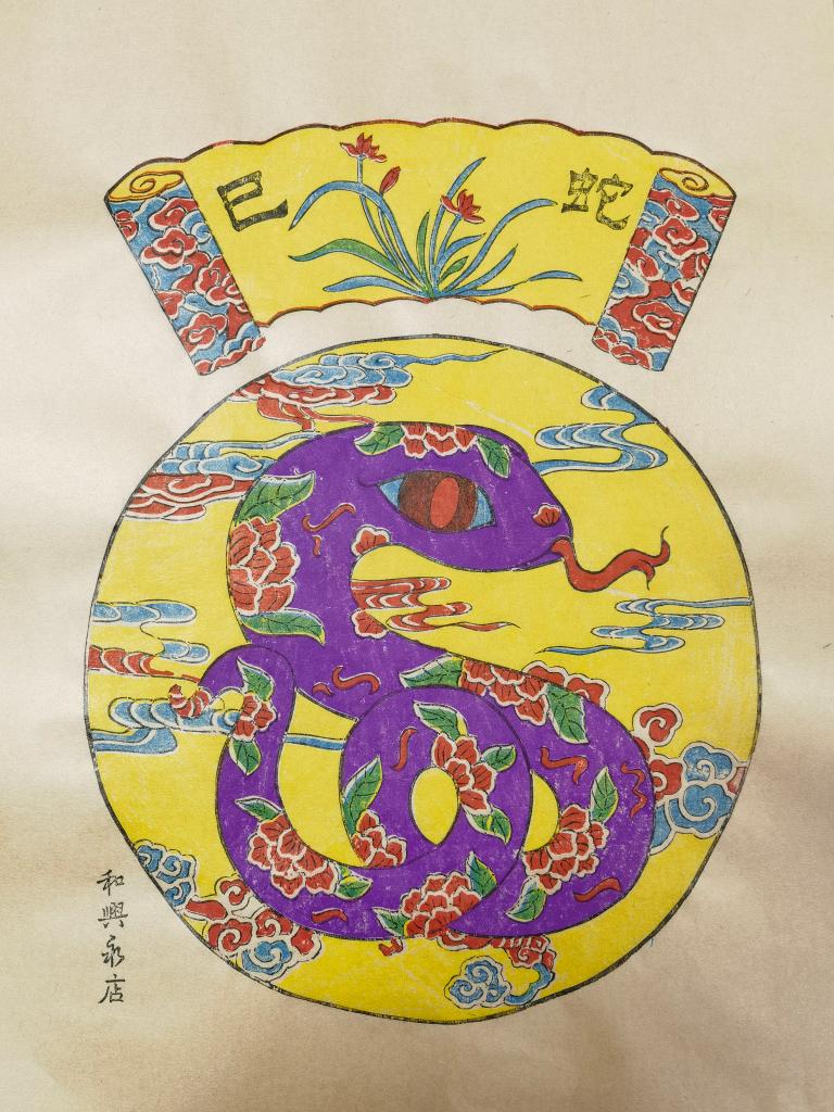 楊乃東創作的《靈蛇獻瑞 紫氣東來》年畫。新華社記者 王志 攝