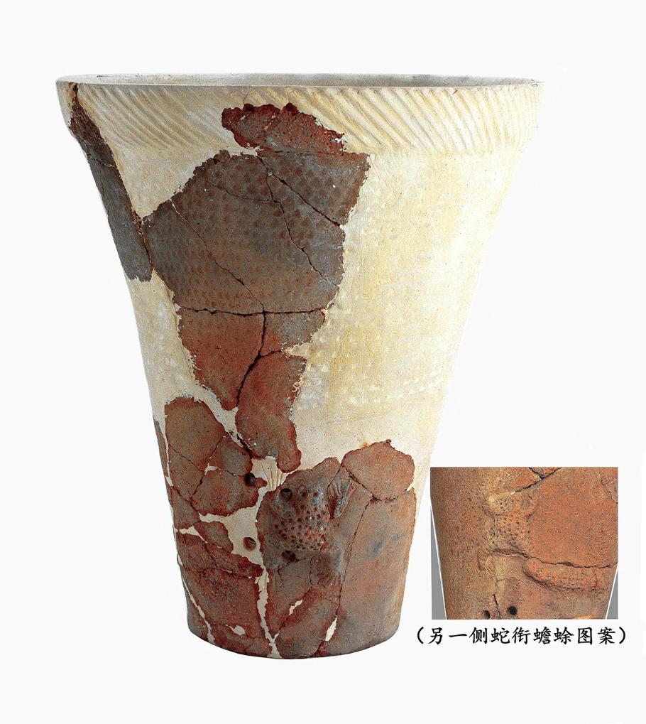 蛇銜蟾蜍筒形陶罐。(遼寧省博物館供圖)