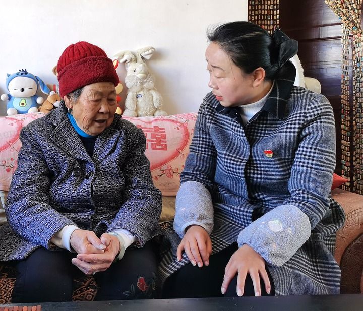 楊汝鈺(右)在社區一位老人家中進行入戶慰問。新華社發(李建華攝)