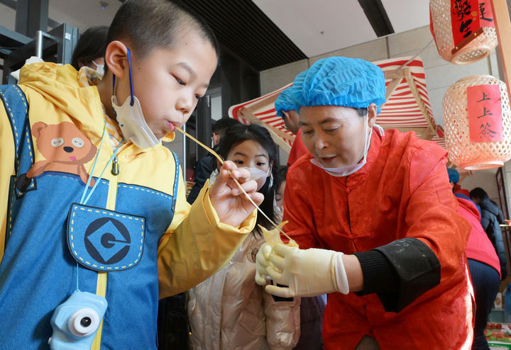 2025年1月29日,小朋友在位于北京的中國非物質文化遺產館舉行的“過年——春節主題展”上體驗“吹糖人”。新華社記者 李賀 攝