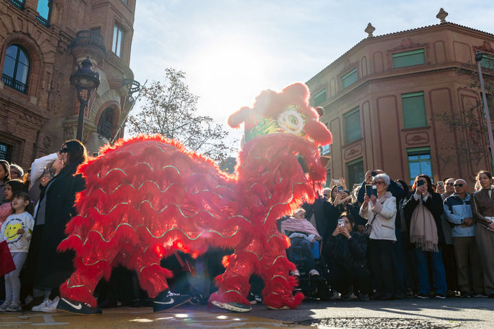 2025年1月25日,在西班牙巴塞羅那,演員在“與巴塞羅那共慶新春佳節”活動上表演舞獅。新華社發(胡安·戈薩攝)