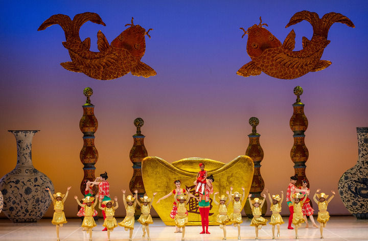 2025年1月29日晚,中國中央芭蕾舞團演員和美國小朋友在美國首都華盛頓肯尼迪表演藝術中心演出賀歲舞劇《過年》。新華社記者 胡友松 攝