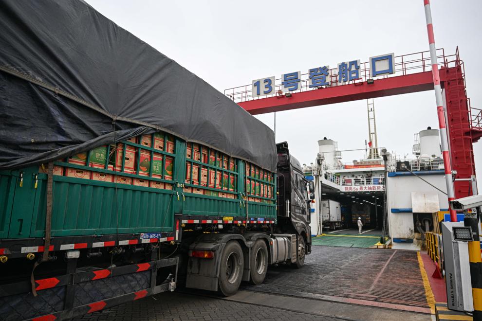 2月3日,一輛鮮活農產品運輸車在??谛潞8鄞a頭登船口登船。新華社記者 蒲曉旭 攝