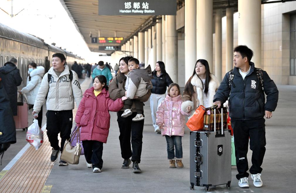 2月4日,旅客在河北省邯鄲火車站進站乘車。當日是春節假期的最后一天,全國各地迎來返程高峰。新華社發(郝群英攝)
