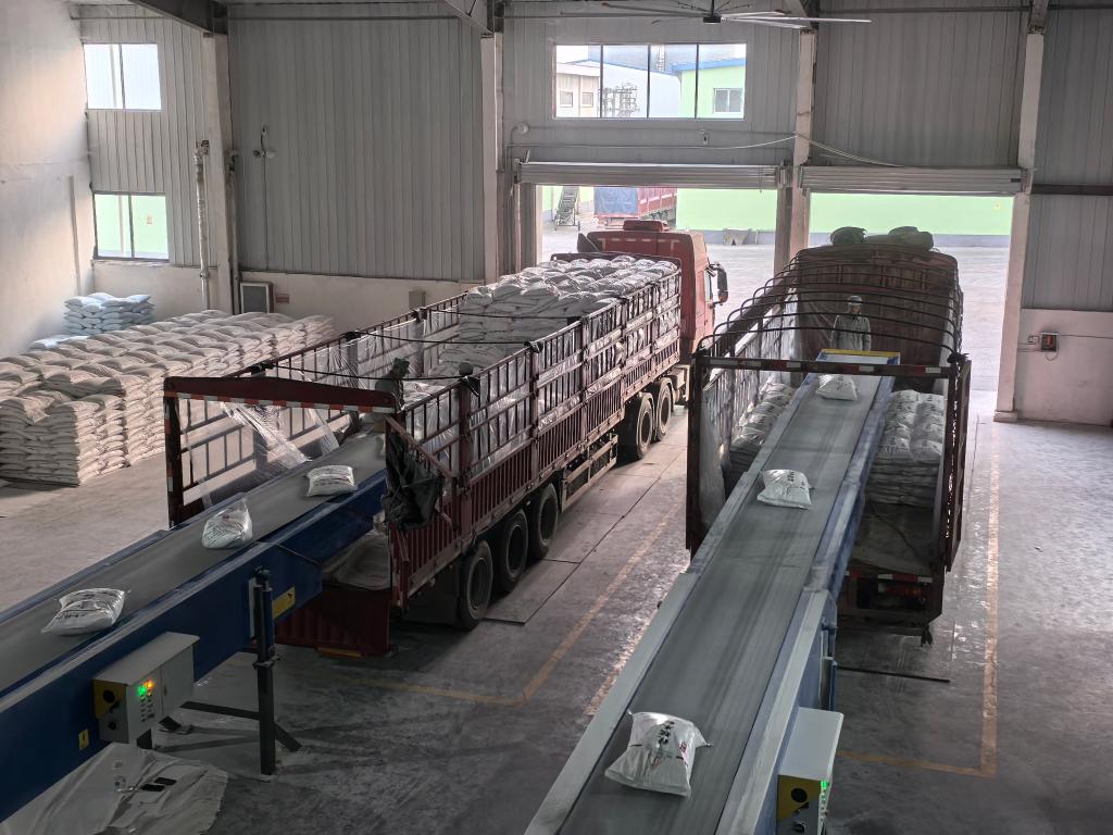 余飛的包裝生產線正月初七就開工了,記者在廠區內看到,三輛卡車在等待出貨,車間內,一袋袋的糯米粉被傳送帶運送出來。