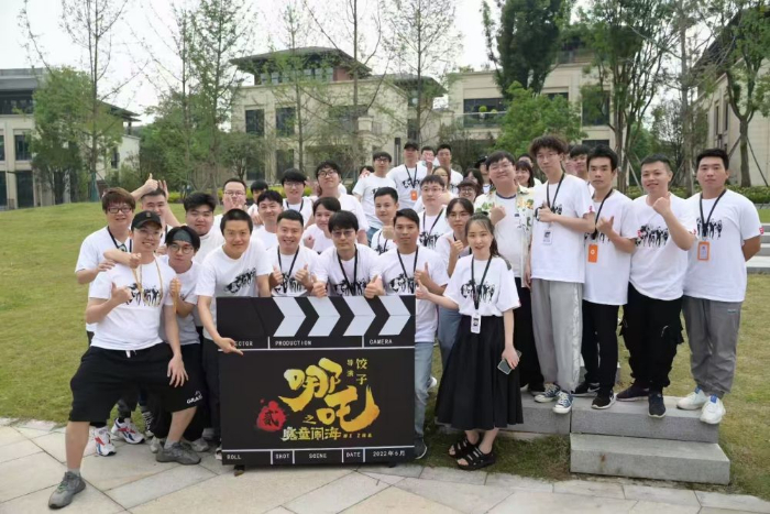 餃子導演(前排左三)和參與《哪吒之魔童鬧?!罚ā赌倪?》)制作的四川傳媒學院部分師生合影。從動畫特效、制片到配音,四川傳媒學院多位師生參與了該電影的制作(資料照片)。新華社發