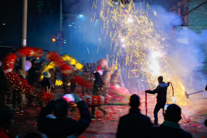 今年首個“非遺版”春節里,在河北井陘,“打鐵花”“打樹花”“獅子火”等非遺焰火交相輝映;廣東梅州的人們在竹篾扎成的“龍身”里裝入各式煙花爆竹,舞龍者手擎“火龍”,繽紛焰火從“龍身”噴出,一時間火光沖天、龍影翻騰。