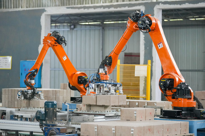 2025年1月7日,湖南省瀏陽市一家花炮生產企業,機械臂在煙花產品流水線上作業。新華社記者 陳澤國 攝
