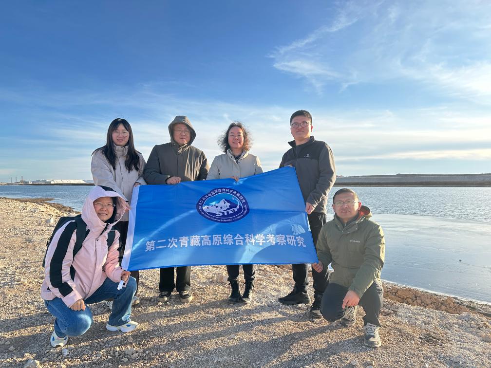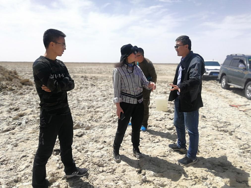 2024年11月25日,王建萍(右三)和科研團隊在鹽湖進行野外考察。(受訪者供圖)