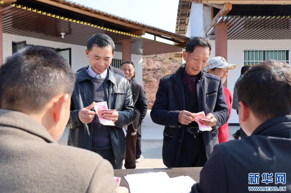 在江西省廣昌縣甘竹鎮朝華村的木耳種植基地,工人們排隊領取工資。新華網 王曉震 攝