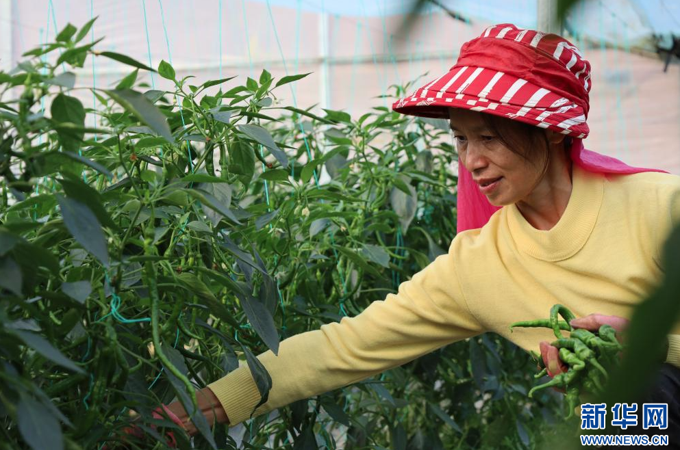 在江西省廣昌縣頭陂鎮設施蔬菜基地,當地村民正在采摘辣椒。新華網 王曉震 攝