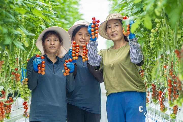 第二站看先進的設施農業技術。北京宏福國際農業科技有限公司的現代化玻璃溫室內,一串串番茄掛在數米高的藤蔓上,每一株間距相當、掛果相當,水肥溫度等都由智能設備精準控制,以便達到最佳口感和產量。