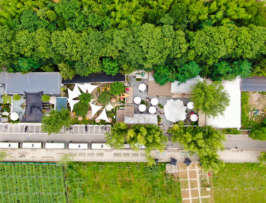 位于秦嶺腳下的陜西省西安市鄠邑區栗峪口村,一家由廢棄粉石廠改造而成的咖啡館,員工基本來自村民(2024年6月20日攝,無人機照片)。新華社記者 蔡湘鑫 攝