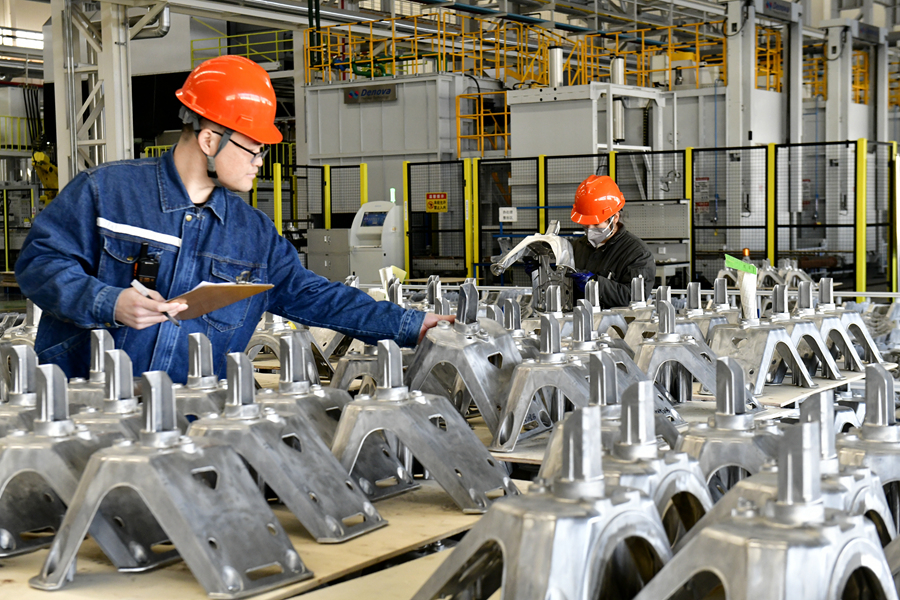 2025年2月26日,在山東宏燦材料科技有限公司,工作人員檢查汽車輕量化精密鋁合金結構件。新華社記者 郭緒雷 攝