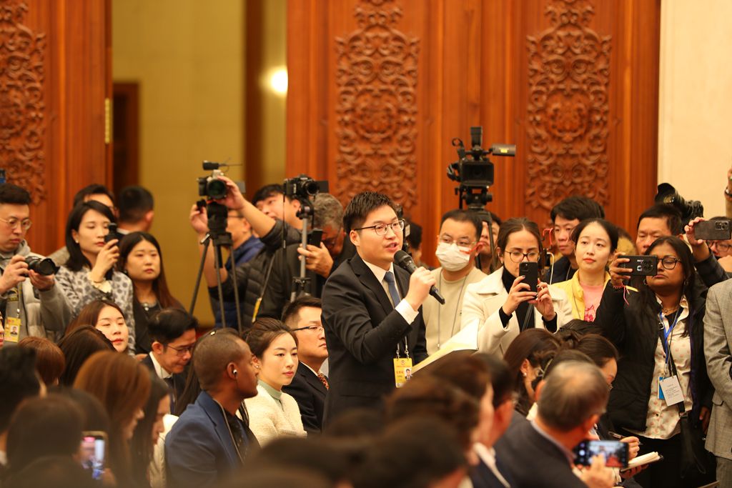 3月3日,全國政協十四屆三次會議新聞發布會在北京舉行,大會新聞發言人劉結一向中外媒體介紹本次大會有關情況并回答記者提問。圖為記者在現場提問。新華網記者 王翰林 攝