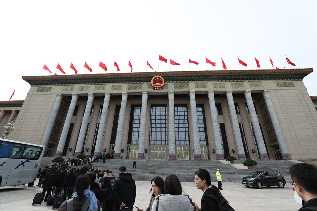 3月3日,全國政協十四屆三次會議新聞發布會在北京人民大會堂舉行,大會新聞發言人劉結一向中外媒體介紹本次大會有關情況并回答記者提問。圖為記者在人民大會堂外排隊入場。新華網記者 王翰林 攝
