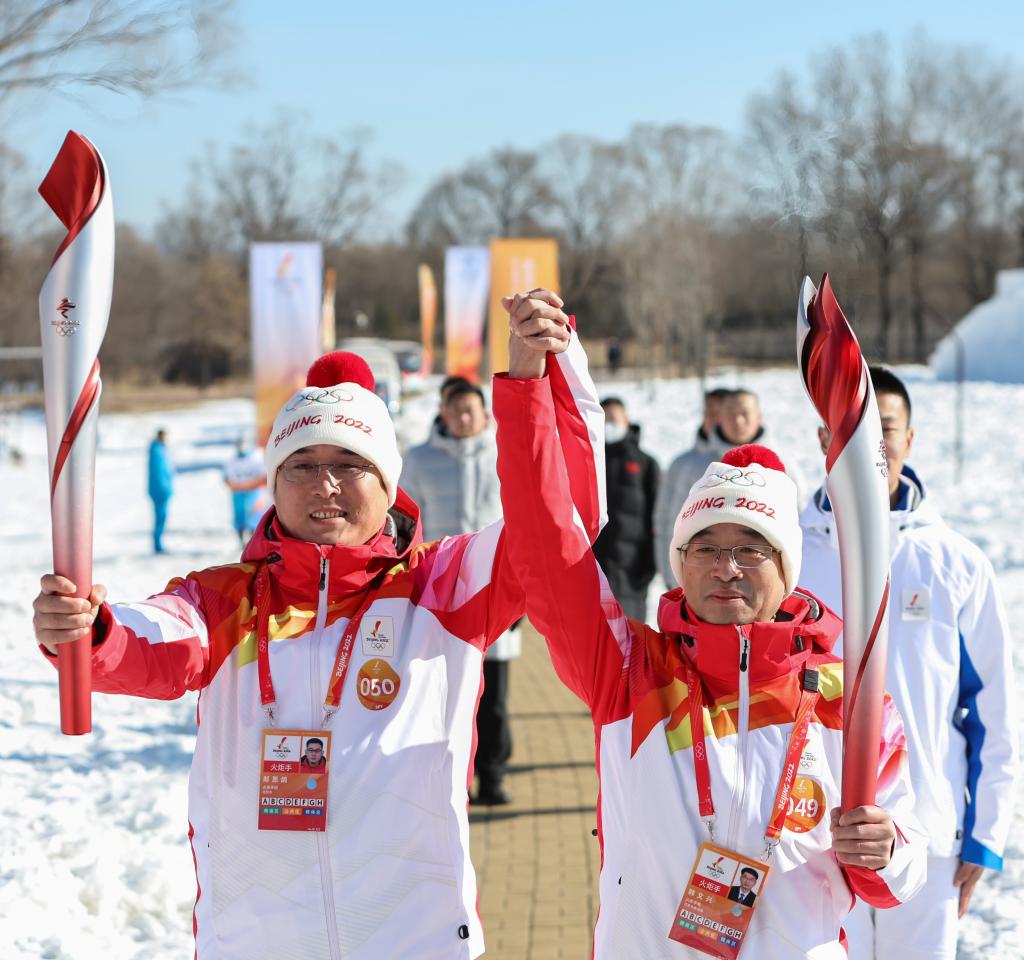 ↑圖為北京冬奧會火炬手郎恩鴿(左)在進行火炬傳遞