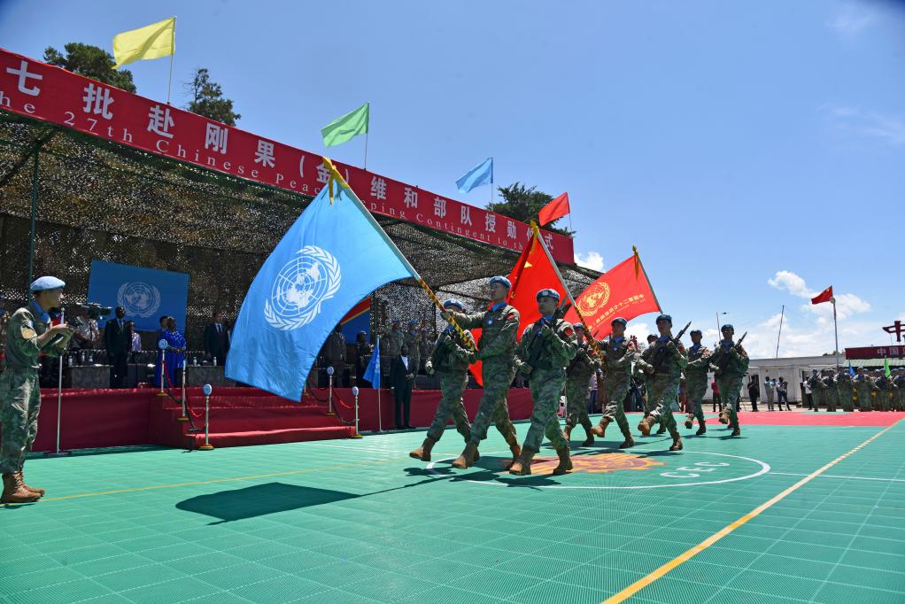 2024年4月9日,在剛果(金)南基伍省布卡武市的中國半島營區,中國第27批赴剛果(金)維和部隊官兵被授予聯合國“和平勛章”。新華社發