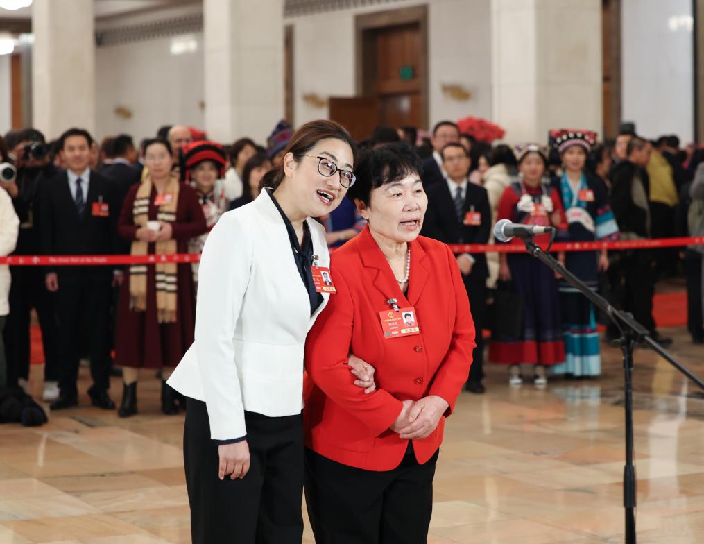 3月8日,第十四屆全國人民代表大會第三次會議第二場“代表通道”集中采訪活動在北京人民大會堂舉行。這是全國人大代表盛弘(左)和楊寶玲向廣大婦女致以節日祝福。