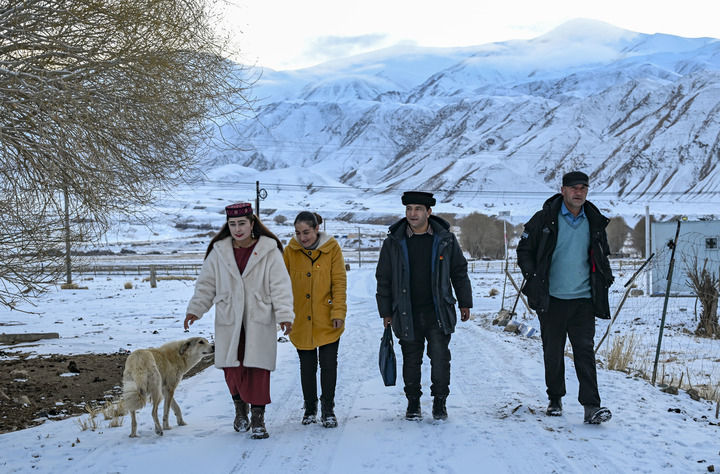 2025年1月3日,全國人大代表多來提曼·開米克(右二)在新疆塔什庫爾干塔吉克自治縣瓦恰鄉夏布孜喀拉村走訪。新華社記者 陳朔 攝