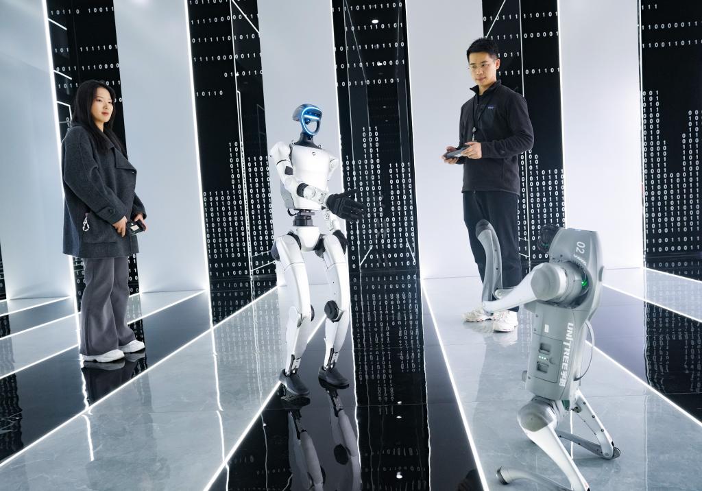 2025年3月1日,在杭州宇樹科技有限公司的產品展示中心,人形機器人和四足機器人在工作人員控制下做動作。新華社記者 翁忻旸 攝