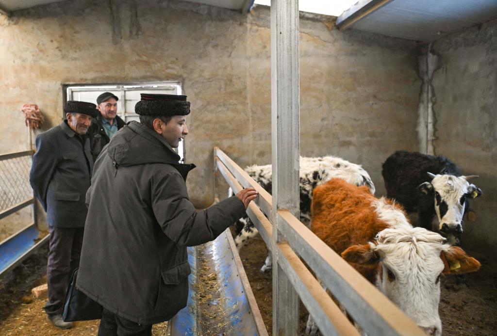 1月3日,在新疆喀什地區塔什庫爾干塔吉克自治縣瓦恰鄉夏布孜喀拉村,多來提曼·開米克在一戶村民的棚圈中實地了解牲畜越冬情況。